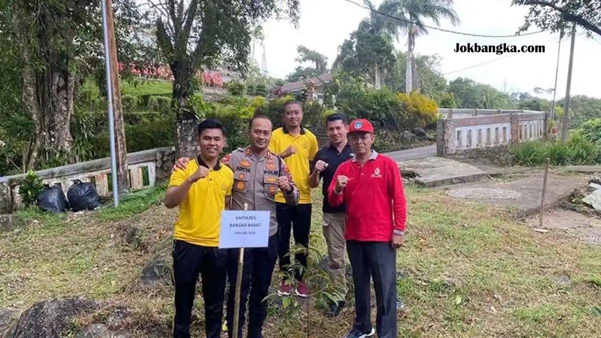 JokBangka – #MENTOK, #BANGKA BARAT — #Kapolres #Bangka Barat #AKBP #Pradana #Aditya #Nugraha #melakukan #aksi #nyata #pelestarian lingkungan dan sejarah yang dikemas melalui kegiatan penanaman pohon durian Namlung di kawasan Pesanggrahan Menumbing, Kecamatan Mentok, Kabupaten Bangka Barat, Provinsi Kepulauan Bangka Belitung, pada Jumat, 23 Januari 2026.